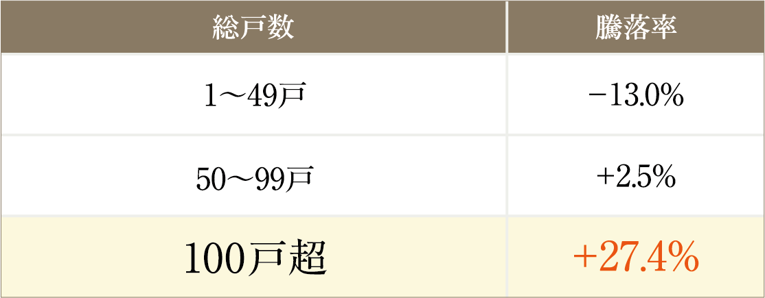 100戸超の大規模物件は騰落率が27.4%と上昇し、